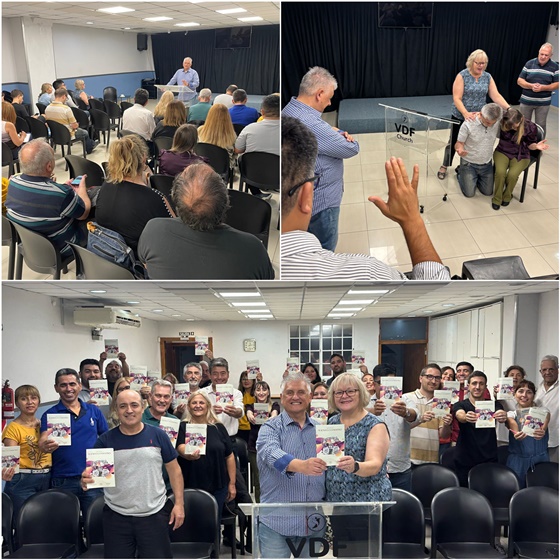 Por la noche, se reunieron con los pastores y líderes de Buenos Aires. Todos se sacaron fotos con Aliento Cotidiano. El pastor Omar habló citando Hechos 20, el discurso de despedida de Pablo a los ancianos de Éfeso y resaltó las palabras del apóstol: "sirviendo al Señor con toda humildad". Al finalizar la enseñanza, honraron y oraron por el matrimonio Olah, quienes en los días próximos comenzarán a servir al Señor en la regional Entre Ríos y gozarán de la etapa de jubilación. ¡Días de despedidas!